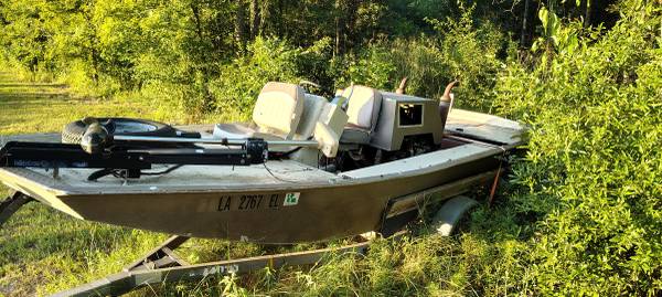 This is an old school Cajun mudboat. Has a new motor but needs a new flywheel. Motor is a 3.8 liter V6 from a 1980 Camaro and has a street dominator intake with a 4 barrel carb from a 1980 Corvette. Boat makes a ton of power and does about 40 mph in the water will consider trading for a tractor