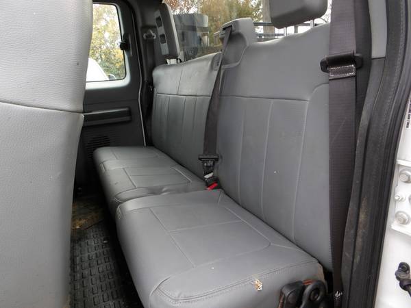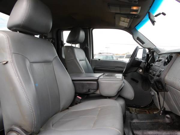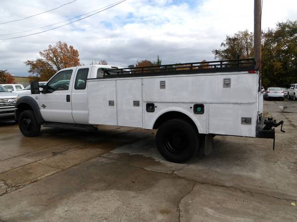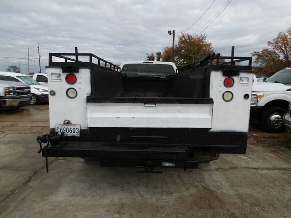 The exterior is white and has a utility bed with storage compartments, running bars, tow package, and 19.5” dual rear wheels. The interior is gray and has vinyl seats, fold down center console, stereo, AUX port, cruise control, tilt steering wheel, interval wipers, and A/C. It is 2 wheel drive with automatic transmission and has a 6.7L Power Stroke B20 diesel engine with 176,000 miles. #4387. Contact 318-267-8446 or 318-537-3024 for more details.